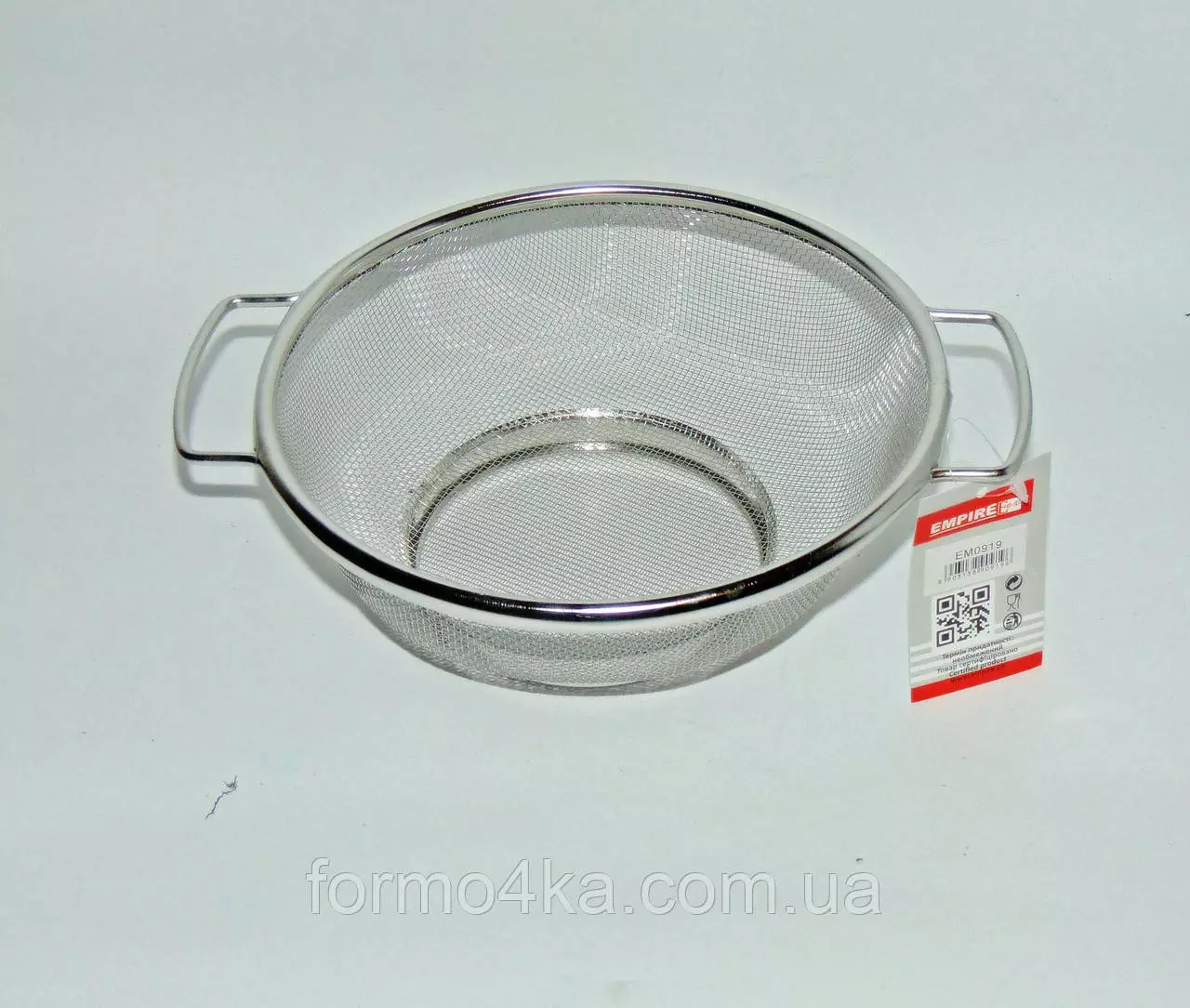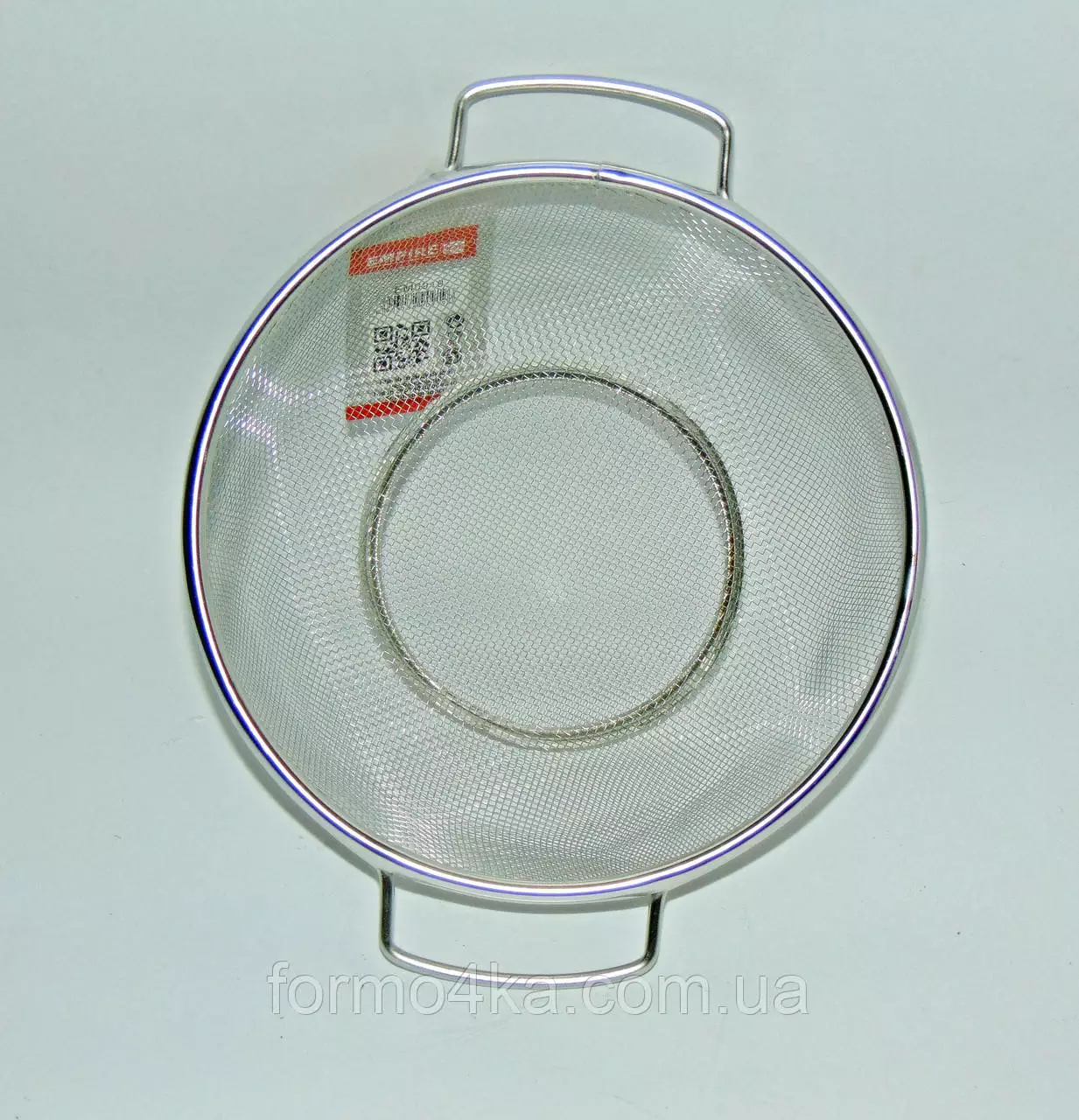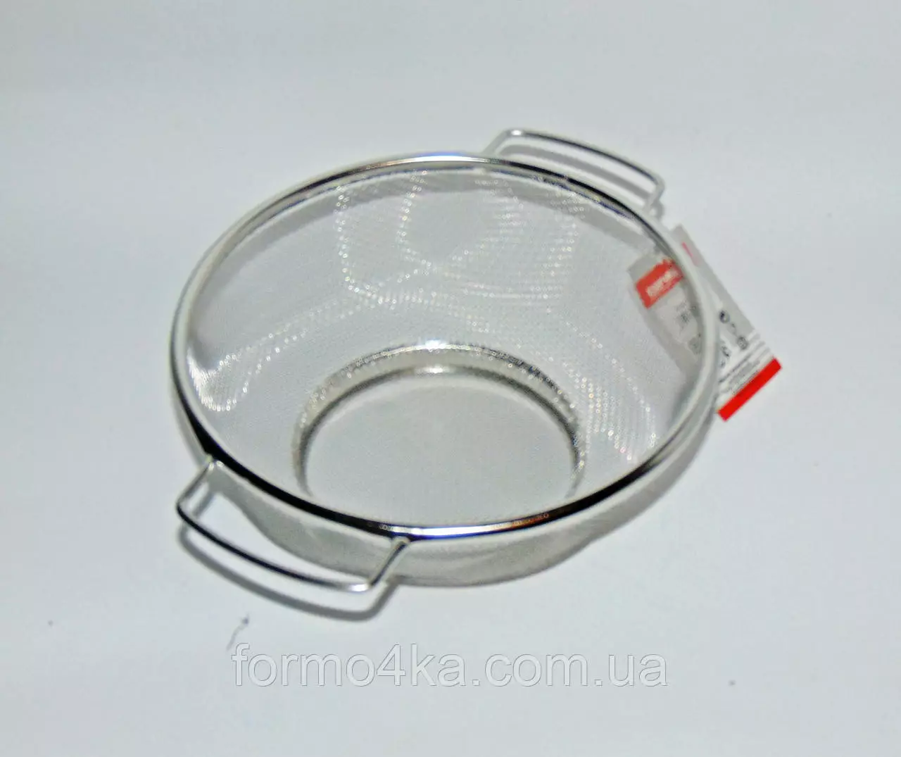 Дуршлаг с металлической сеткой с двумя металлическими ручками.
