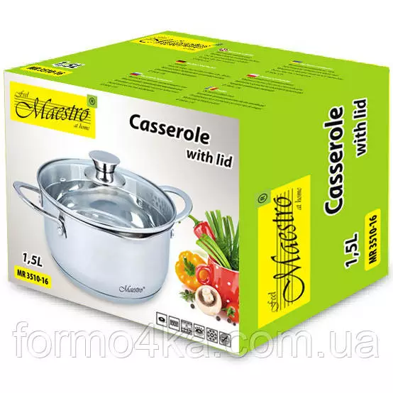 Кастрюля MR3510-16 из высококачественной нержавеющей стали 18/10, не вступающей в реакцию с пищей (не окисляется).
