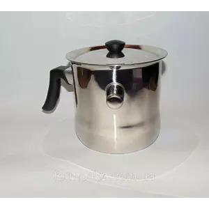 Молочник из нержавеющей стали. С крышкой. Бакелитовая ручка на крышке и корпусе. Конструкция с двойной стенкой. Легко мыть. Подходит для всех видов плит, кроме индукционной. Свисток на корпусе для выхода пара.
