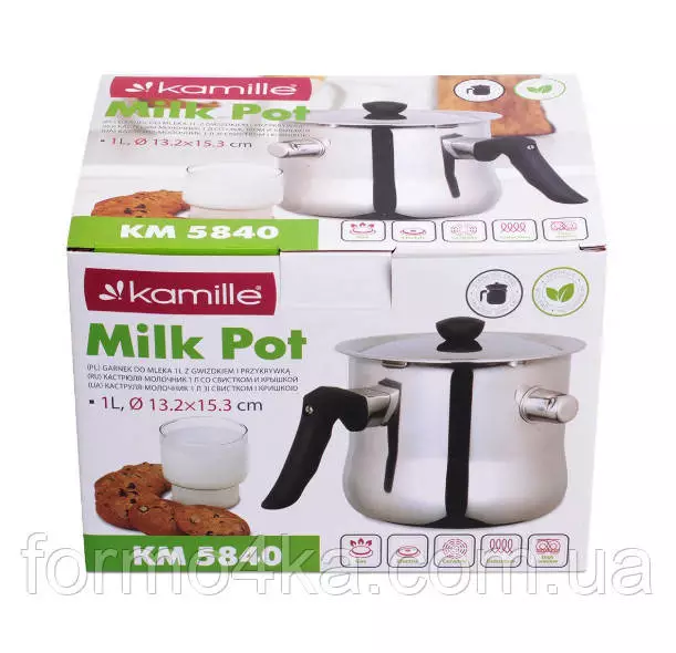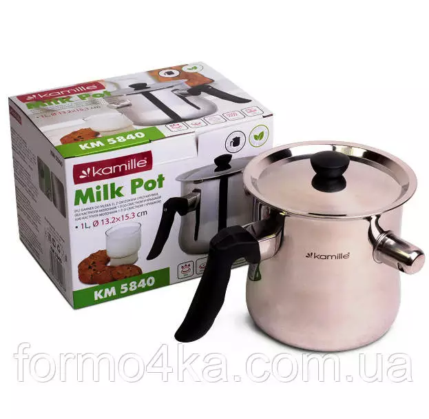 Молочник Kamille KM5840 имеет следующие преимущества: - двойные стенки увеличивают безопасность при подогреве жидкости, а грамотно продуманная конструкция позволит в кротчайшее время довести до нужной температуры - ненагревающаяся бакелитовая ручка минимизирует дискомфортные ощущения при горячем состоянии молочника
