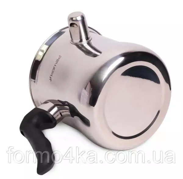 Молочник из нержавеющей стали. С крышкой. Бакелитовая ручка на крышке и корпусе. Конструкция с двойной стенкой. Легко мыть. Подходит для всех видов плит, кроме индукционной. Свисток на корпусе для выхода пара.