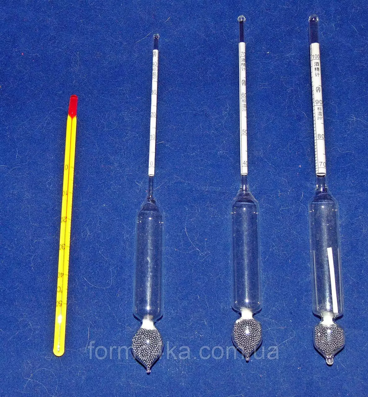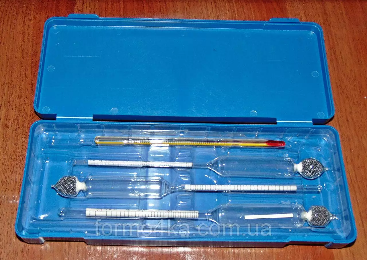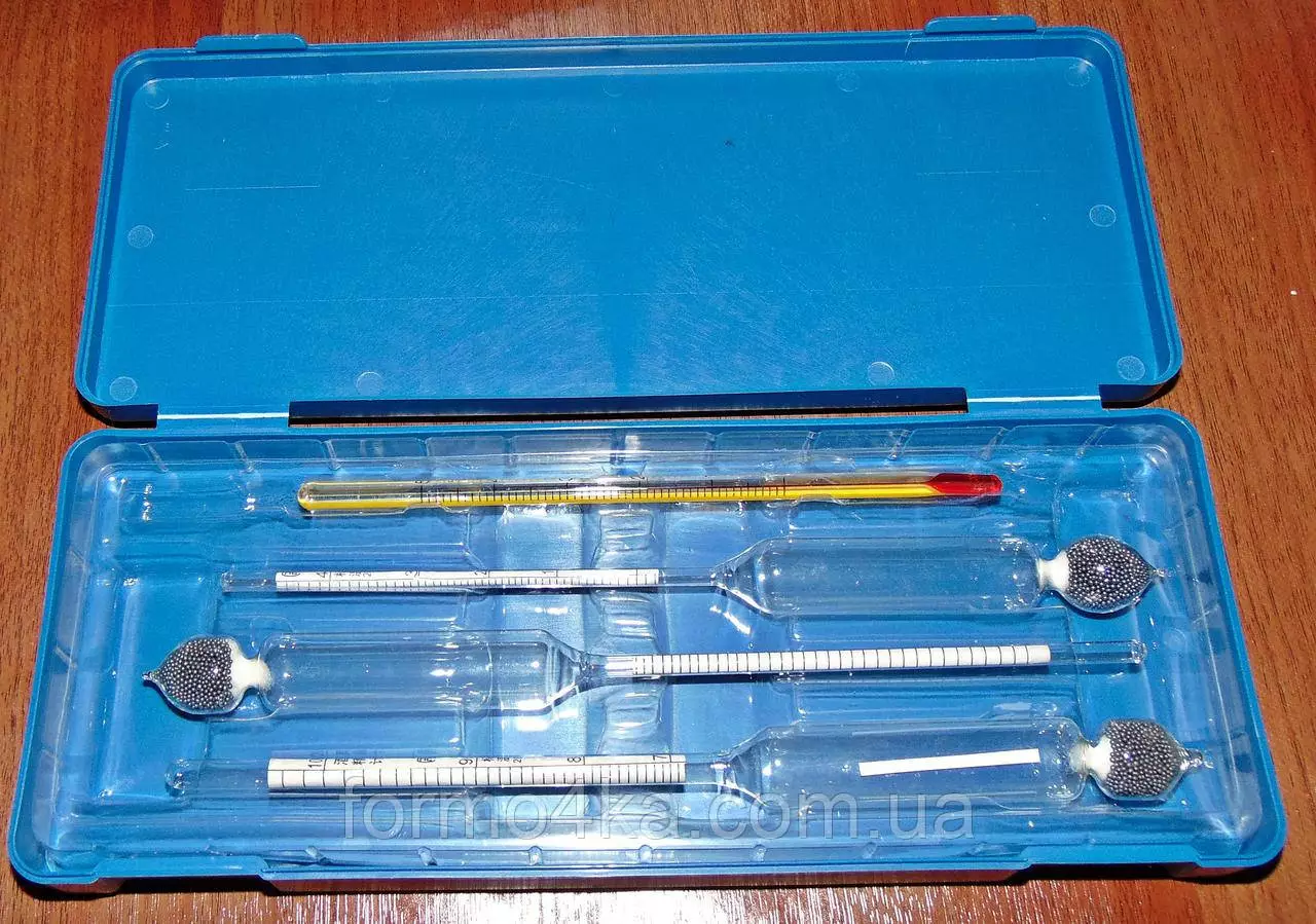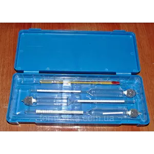 В комплект входят Ареометр стеклянный 0-40град, Ареометр стеклянный 40-70град, Ареометр стеклянный 70-100град, термометр 0-50град, пластиковый футляр