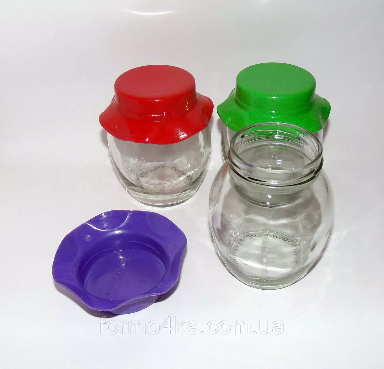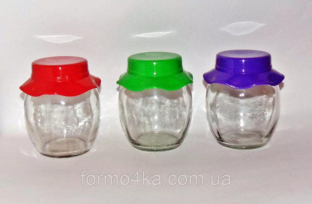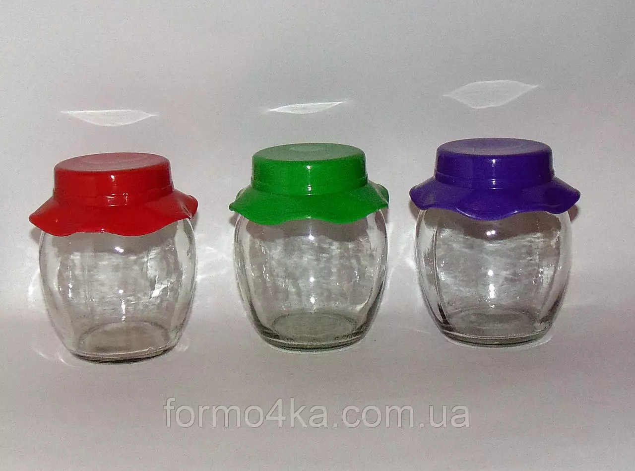 Банки стеклянные в форме бочонка с пластиковой крышкой в виде шляпки