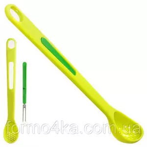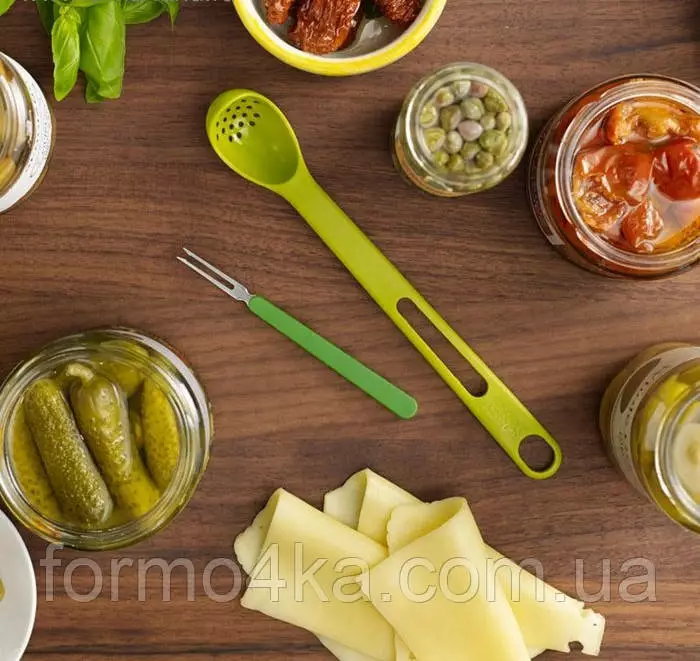 В набор входит два предмета - ложечка с отверстиями и длинной ручкой, которая позволит извлекать оливки или маслины даже из самых глубоких банок и соединенная с ложкой вилочка удобна для подачи всевозможных солений: маринованных грибов, корнишонов и так далее.
