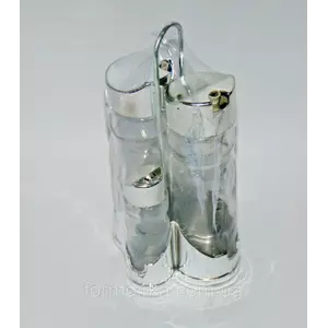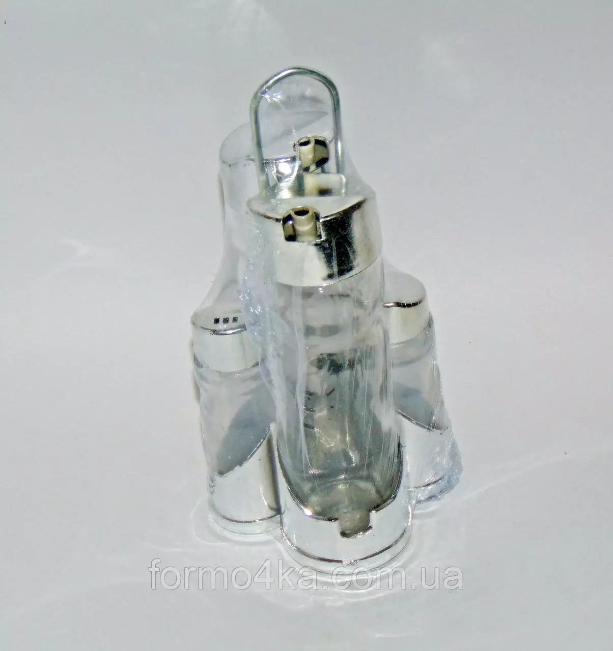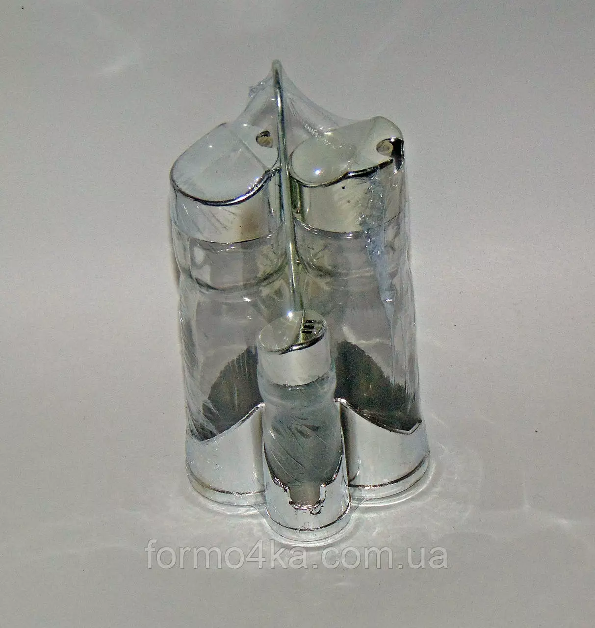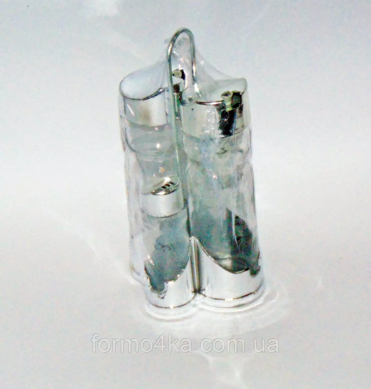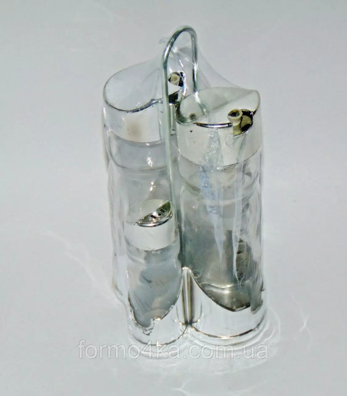 Набор стеклянных емкостей - две маленьких для соли и перца с крышками с отверстиями, две больших для жидкостей (масла. уксуса. жидких соусов) на подставке