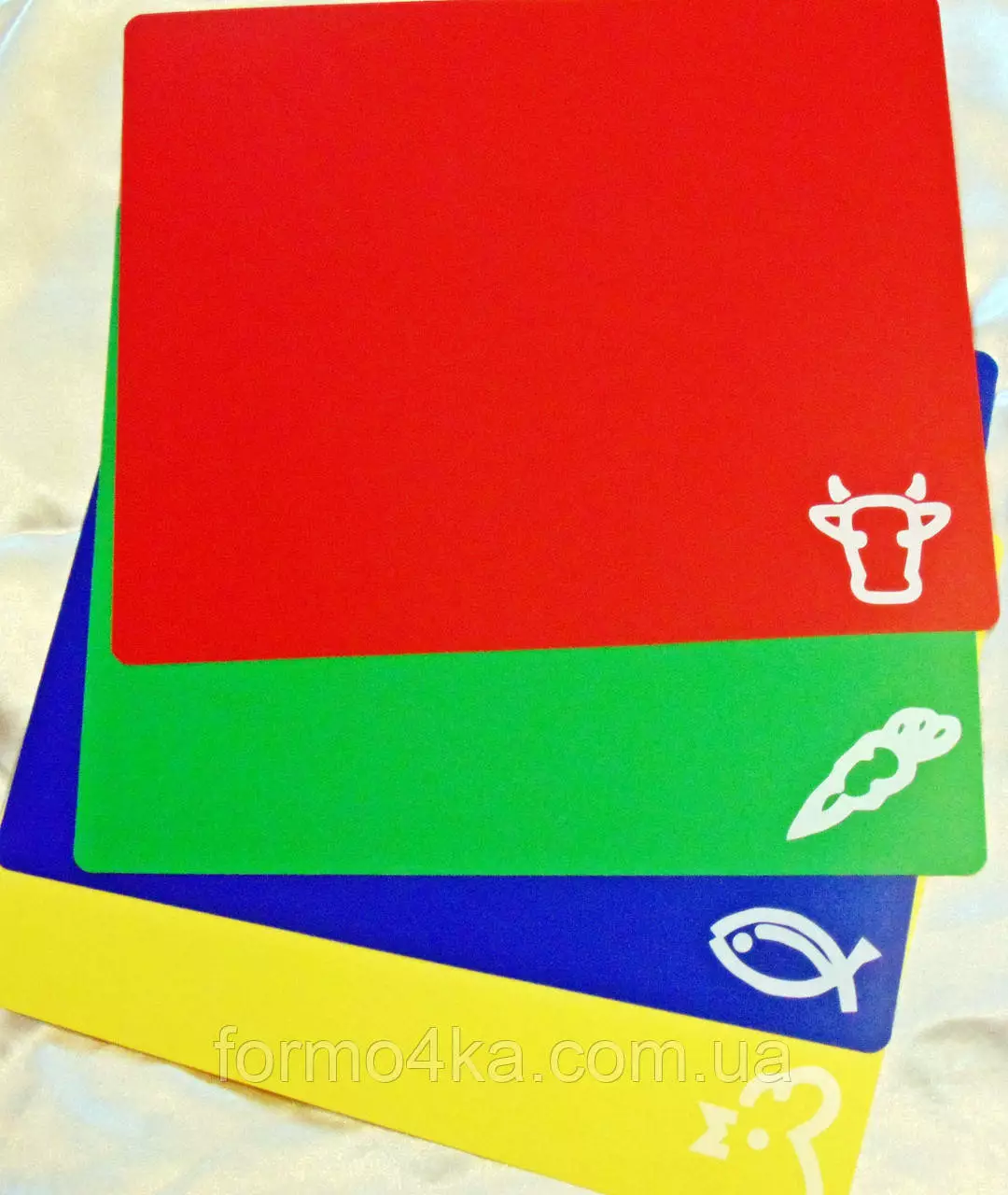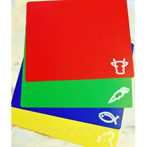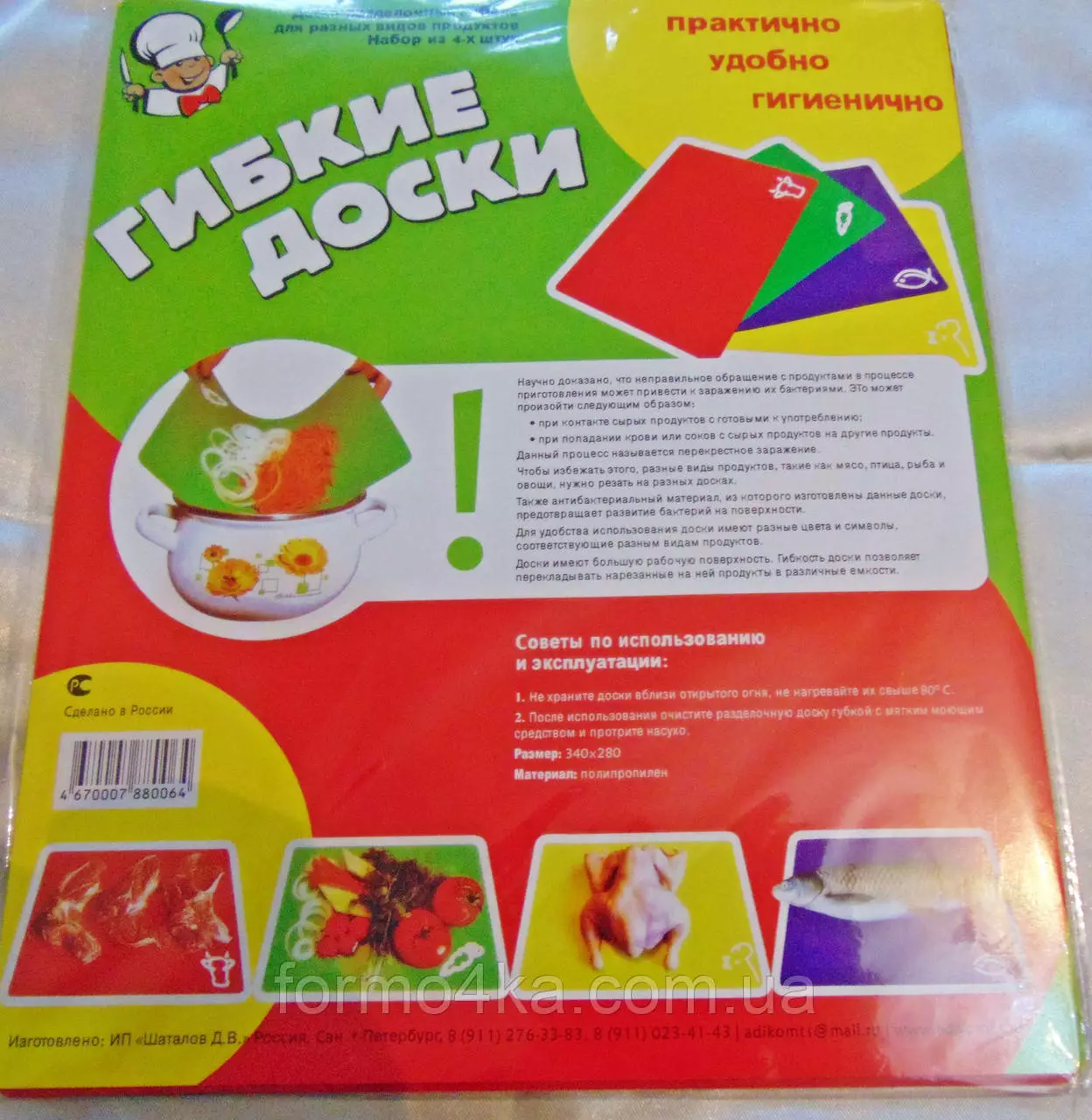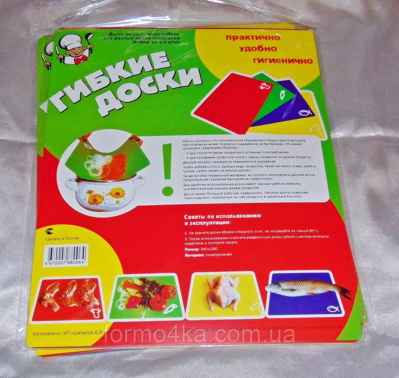 Набор из 4-х гибких досок. Доски изготовлены из специального пластика, легко гнутся и сворачиваются. Теперь овощи, фрукты и мясо попадут точно в тарелку или кастрюлю. Каждая доска промаркирована пиктограммой в углу и имеет свой цвет, поэтому вы не перепутаете доску для мяса с доской для рыбы или овощей. Доска не скользит по поверхности стола, она тонкая и легкая.
