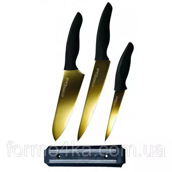 Лезвия ножей из нержавеющей высококачественной стали с золотистым покрытием PVD. Удобные бакелитовые черные ручки. Для профессионального и любительского приготовления пищи. Набор пригоден для мытья в посудомоечной машине.
