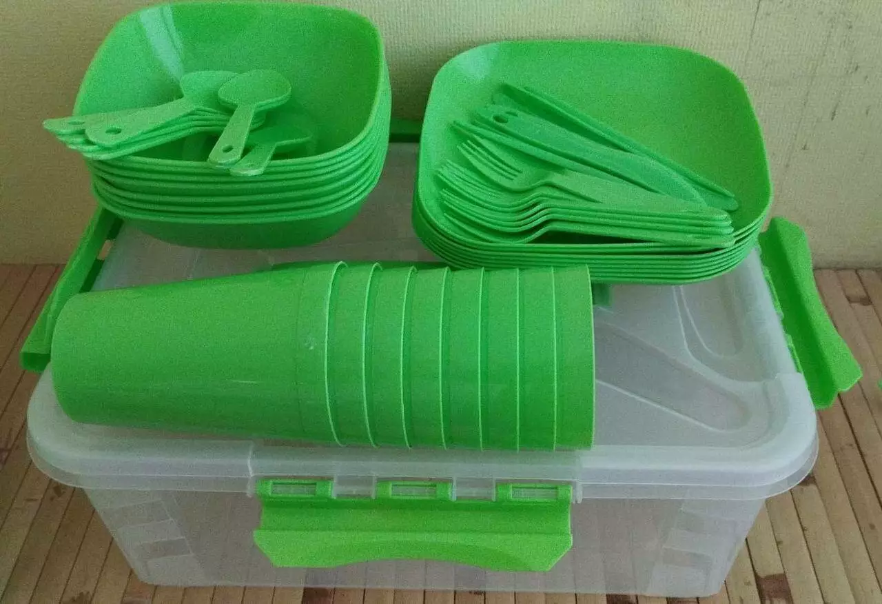 Набор многоразовой посуды для пикника 49 предмета, изготовлен из пищевого пластика и рассчитан на 8 персон, но на самом деле хватит и на больше компанию. Такой набор посуды, очень компактный и удобный, пригодится в поход на природу, для фуршета, в частный дом. Посуда высокого качества и стильным внешним видом. Использовать такую посуду удобно и безопасно, так как она не бьющаяся. Хранить и носить посуду можно в большом контейнере с ручкой.