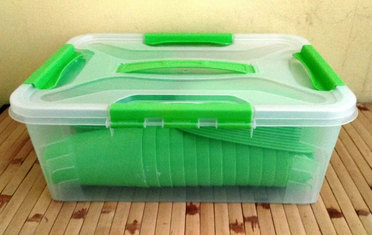 Контейнер объем 10л который закрывается с четырех сторон крышкой с ручкой.