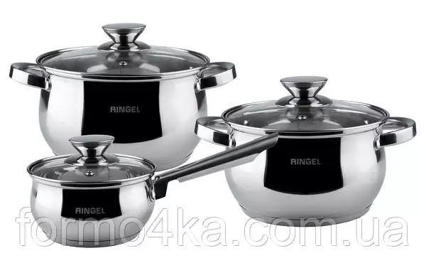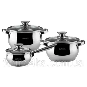 Минимально-необходимый набор посуды для хозяйки собрано в наборе посуды RINGEL Hamburg: ковш 1,25 л, кастрюли 2,9л и 3,9 л. Выполненные в одном стиле предметы набора из нержавеющей стали со стеклянными крышками, помогут любой хозяйке приготовить любимые блюда.