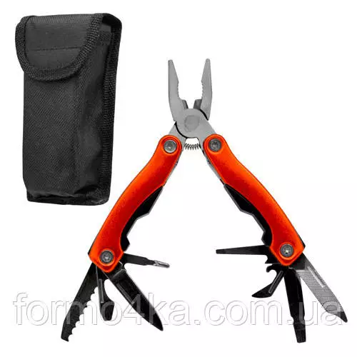 9 функций: нож, открывалка, консервный нож, пилочка, отвертка прямая, отвертка крестообразная, плоскогубцы, чехол с возможностью подвесить на пояс