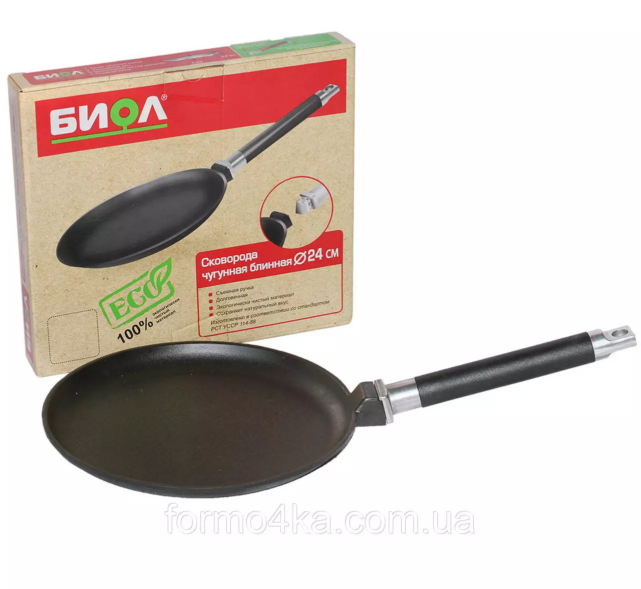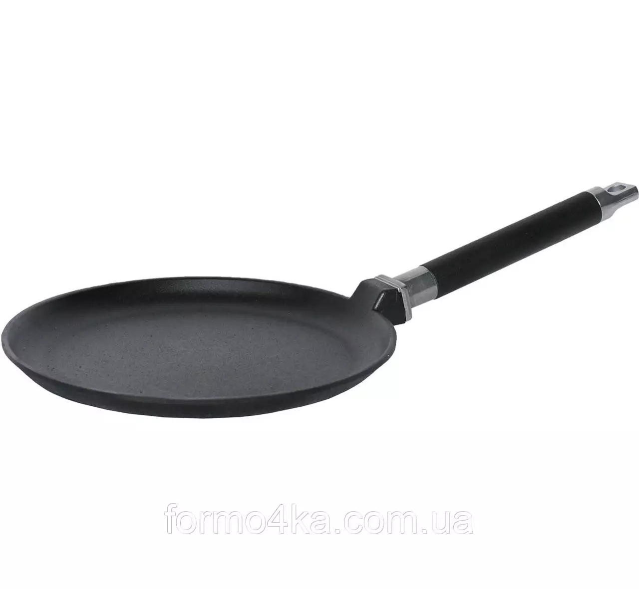 Сковорода блинная со съемной ручкой, удобна для использования на плите любого типа (газ, электро, стеклокерамической или индукционной) и в духовках или печи. Ручка снимается очень легко.