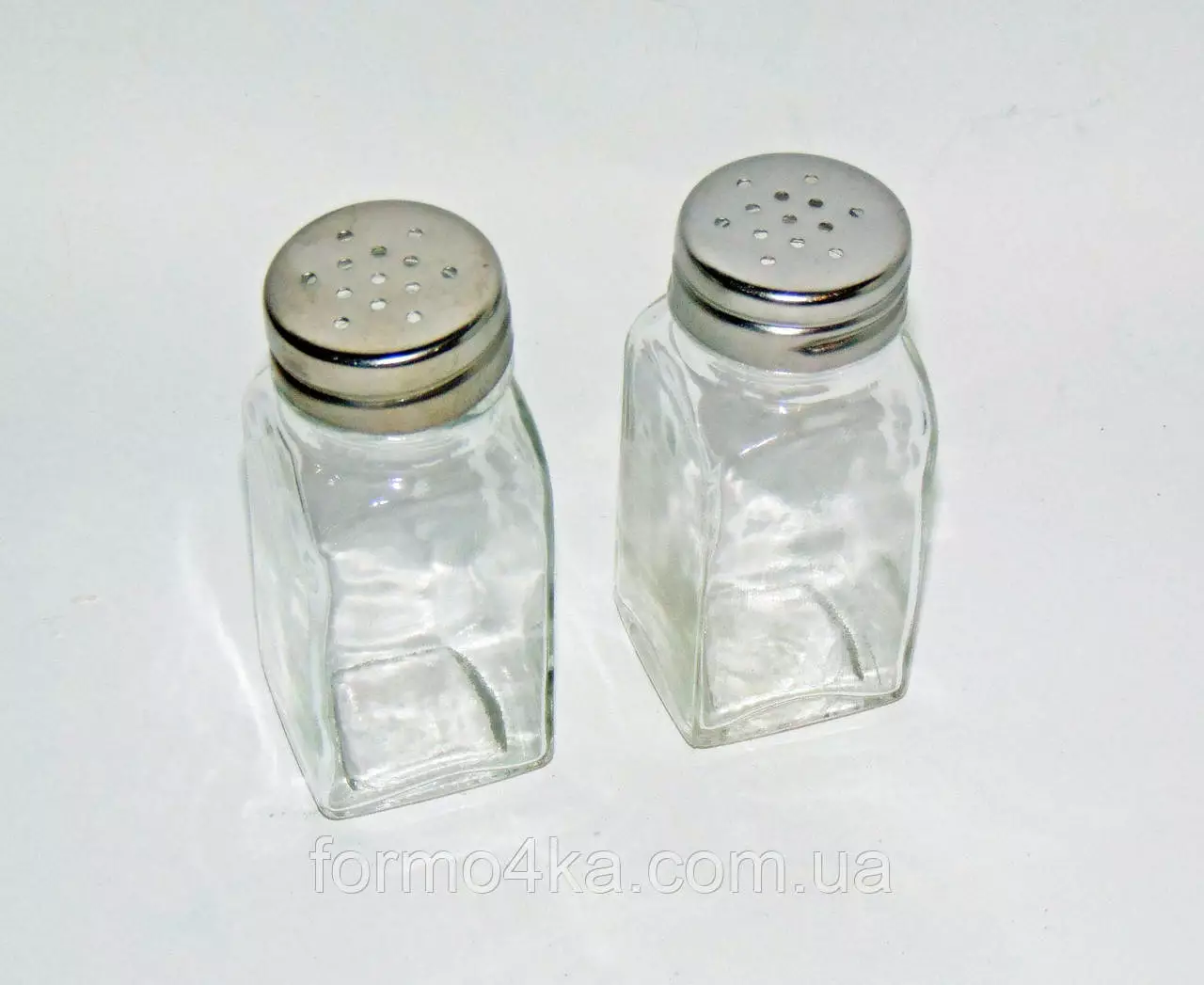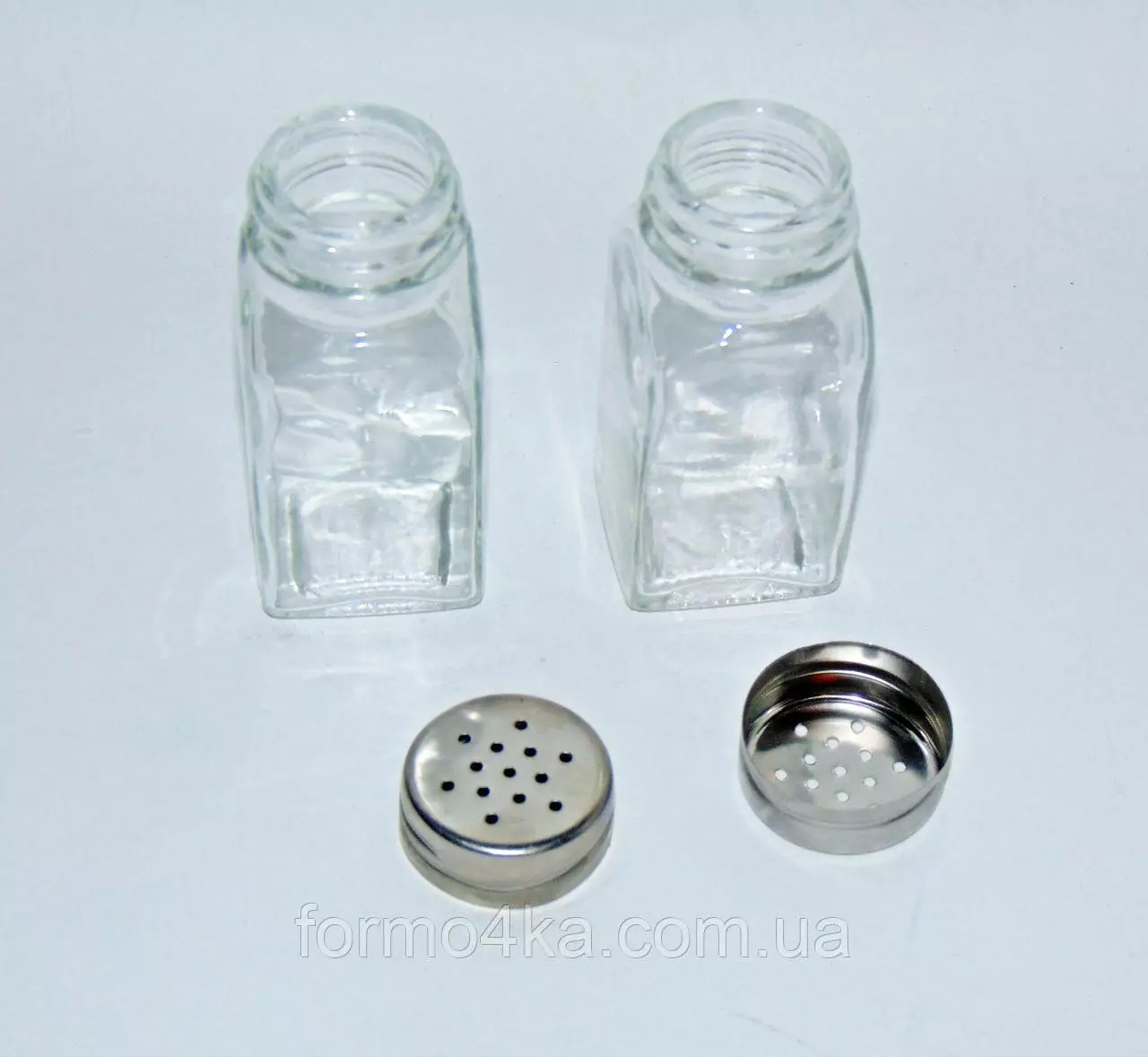 Две стеклянных емкости для соли и перца с металлической крышкой с отверстиями