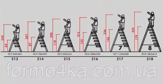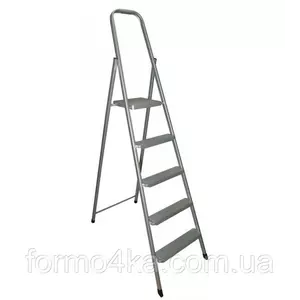 Модель 215 имеет 5 ступеней - 4 ступени и платформа, на ножках лестницы пластиковые антискользящие заглушки, которые исключают скольжение и образование царапин на полу. Стремянка легко раскладывается, а также занимает мало места при хранении в сложенном виде.