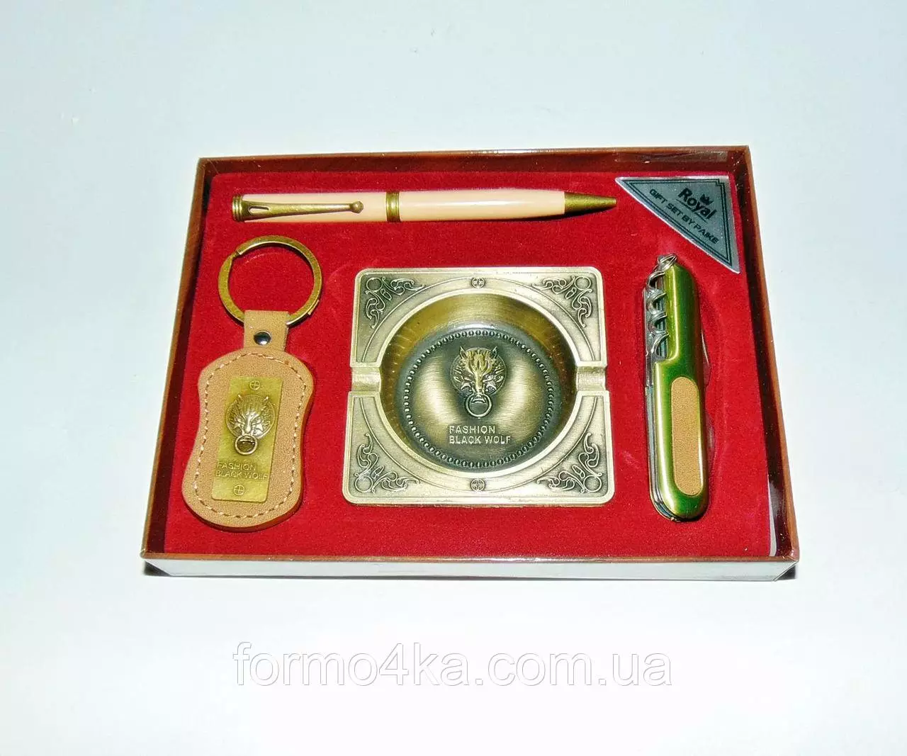 В наборе пепельница, брелок, шариковая ручка, перочинный ножик.
