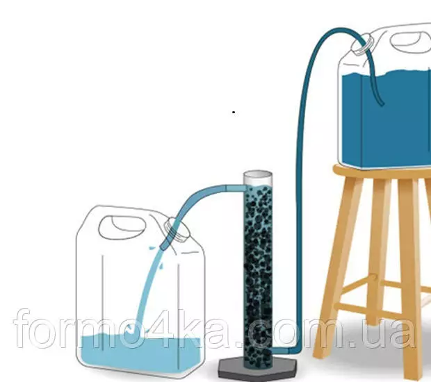 Патрубок-А (находится у основания колонны) соединяет фильтрующую колонну и сосуд с дистиллятом. Через отверстие патрубка-А в угольную колонну поступает дистиллят для фильтрации. Патрубок-В (находится вверху колонны) служит для отхода отфильтрованного дистиллята. Ниже патрубка-В нужно установить посуду для сбора конденсированного дистиллята.