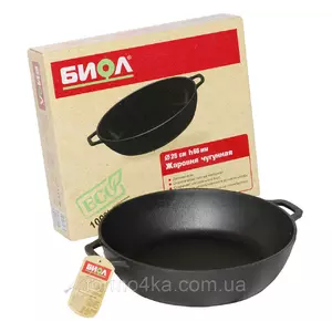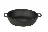 Чугунная сковорода жаровня производства ООО БИОЛ благодаря маленьким ручкам и высоким бортам, кроме жарки и тушения, позволяет запекать блюда в любых печах.